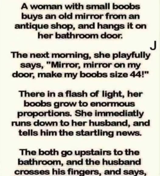 They both go upstairs to the bathroom, and the husband crosses his fingers, and says, “Mirror, mirror on my door, make my penis touch the floor!”