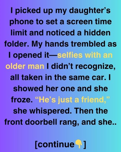 I found a hidden folder on my daughter’s phone while setting a screen time limit. My hands trembled as I opened it—selfies with an unfamiliar older man in the same automobile. I showed her one and she froze. “He’s just a friend,” she muttered. She leaped up like someone had ignited a fire beneath her when the front doorbell rang.