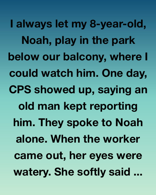 I always let my 8-year-old, Noah, play in the park below our balcony, where I could watch him. One day, CPS showed up, saying an old man kept reporting him. They spoke to Noah alone. When the worker came out, her eyes were watery. She softly said, “He told me something I think you need to hear.”
