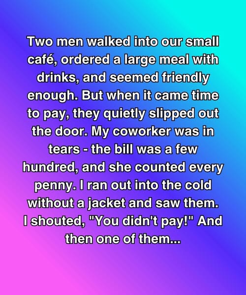 Two men walked into our small café, ordered a large meal with drinks, and seemed friendly enough. But when it came time to pay, they quietly slipped out the door. My coworker was in tears—the bill was a few hundred, and she counted every penny. I ran out into the cold without a jacket and saw them.