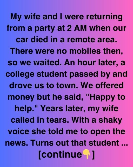 At 2 AM, our car died in a lonely place while returning from a party with my wife. No mobiles, so we waited. A college student drove us to town an hour later. We offered money, but he answered, “Happy to help.” Some years later, my wife called crying. She shakily told me to open the news. This student was running for mayor in our city.