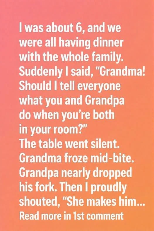 I was about 6, and we were all having dinner with the whole family. Suddenly I said, “Grandma! Should I tell everyone what you and Grandpa do when you’re both in your room?” The table went still, and everyone paused mid-conversation. Grandma lowered her spoon slowly, while Grandpa gave me an uncertain glance. I didn’t notice the tension at all. To me, I was simply sharing something exciting.