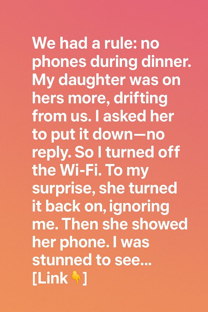 We had a rule: no phones during dinner. My daughter was on hers more, drifting from us. I asked her to put it down—no reply. So I turned off the Wi-Fi. To my surprise, she turned it back on, ignoring me. Then she showed her phone. I was stunned to see… It wasn’t what I thought. Instead of games or endless scrolling, her screen displayed a study group with classmates. They were solving problems together, sharing notes, and encouraging one another.
