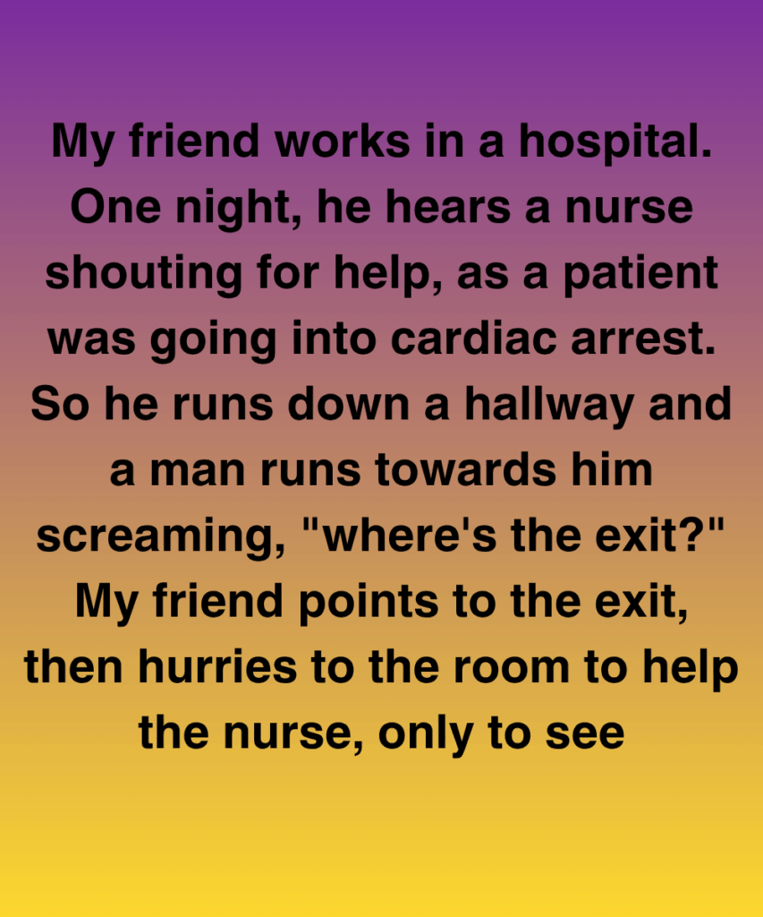 Friend works in hospital. One night, he hears a nurse screaming for aid as a patient goes into cardiac arrest. He runs down a hallway when a man shouts, “Where’s the exit?” My friend gestures to the doorway and rushes to help the nurse, only to find the bed empty, the heart monitor still blaring, and the nurse perplexed.