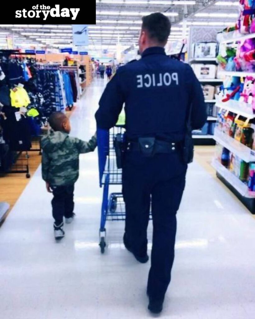In the aisles, they carefully passed toys and clothes until the officer stopped and knelt beside him. “Pick whatever you need, buddy.”