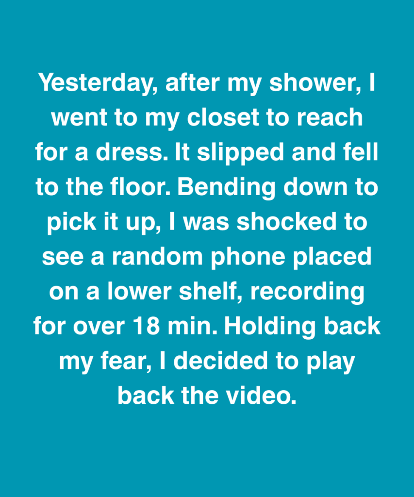 Yesterday, after my shower, I went to my closet to reach for a dress. It slipped and fell to the floor. Bending down to pick it up, I was shocked to see a random phone placed on a lower shelf, recording for over 18 min. Holding back my fear, I decided to play back the video.