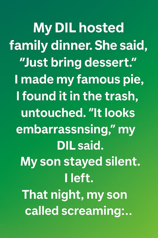 My daughter-in-law hosted a beautiful family dinner, warm lights and soft music filling the room. She told me kindly, “Just bring dessert,” so I prepared my favorite pie, the one everyone used to ask for. When I arrived, I placed it proudly on the counter, excited to share. Later, while helping tidy up, I saw it in the trash—untouched. My heart felt heavy, like someone gently closed a door on a past tradition.