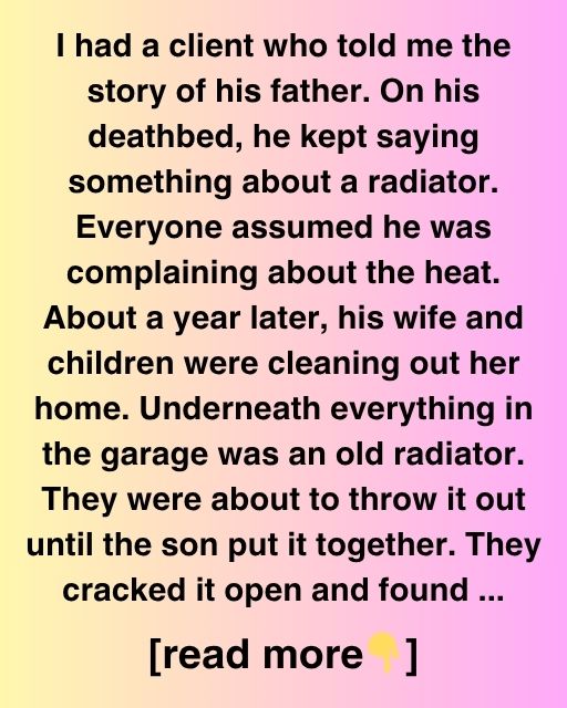 My client told me about his father. He kept talking about a radiator on his deathbed. Everyone thought he was whining about heat. A year later, his wife and kids cleaned out her home. The garage has an old radiator under everything. They were about to toss it out until the son assembled it. It opened to reveal something that changed their lives forever.