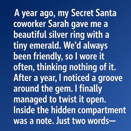 A year ago, my Secret Santa coworker Sarah gave me a beautiful silver ring with a tiny emerald. We’d always been friendly, so I wore it often, thinking nothing of it. After a year, I noticed a groove around the gem. I finally managed to twist it open. Inside the hidden compartment was a note. Just two words—”Keep going.”