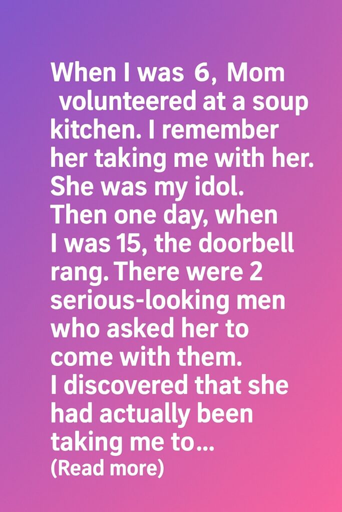 For years, this was our routine. Every Saturday morning, we’d go to the “soup kitchen,” ladle out steaming bowls of soup, and hand out blankets in the winter. I felt proud to be by her side, thinking she was doing something extraordinary for our community. But when I was 15, everything changed. One rainy afternoon, the doorbell rang. When I opened the door, two serious-looking men stood there, their expressions grim. They asked for my mom. She appeared behind me, her face pale as if she had been expecting this moment. “Ma’am, we need you to come with us,” one of them said.