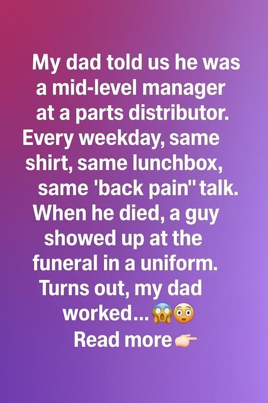 My dad told us he was a mid-level manager at a parts distributor. Every weekday, same shirt, same lunchbox, same “back pain” talk. When he died, a guy showed up at the funeral in a uniform. Turns out, my dad worked… in a completely different role than any of us knew. He wasn’t a manager at all—he was a maintenance worker who kept an entire facility running behind the scenes. The man who came to pay his respects said, “Your dad saved our day more times than I can count. He never wanted credit, but he deserved all of it.”