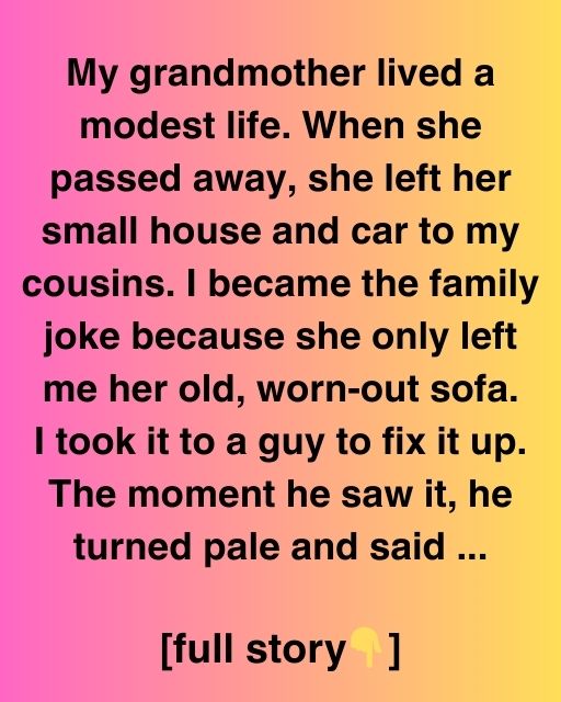My grandmother lived a modest life. When she passed away, she left her small house and car to my cousins. I became the family joke because she only left me her old, worn-out sofa. I took it to a guy to fix it up. The moment he saw it, he turned pale and said, “Do you know what this is?”
