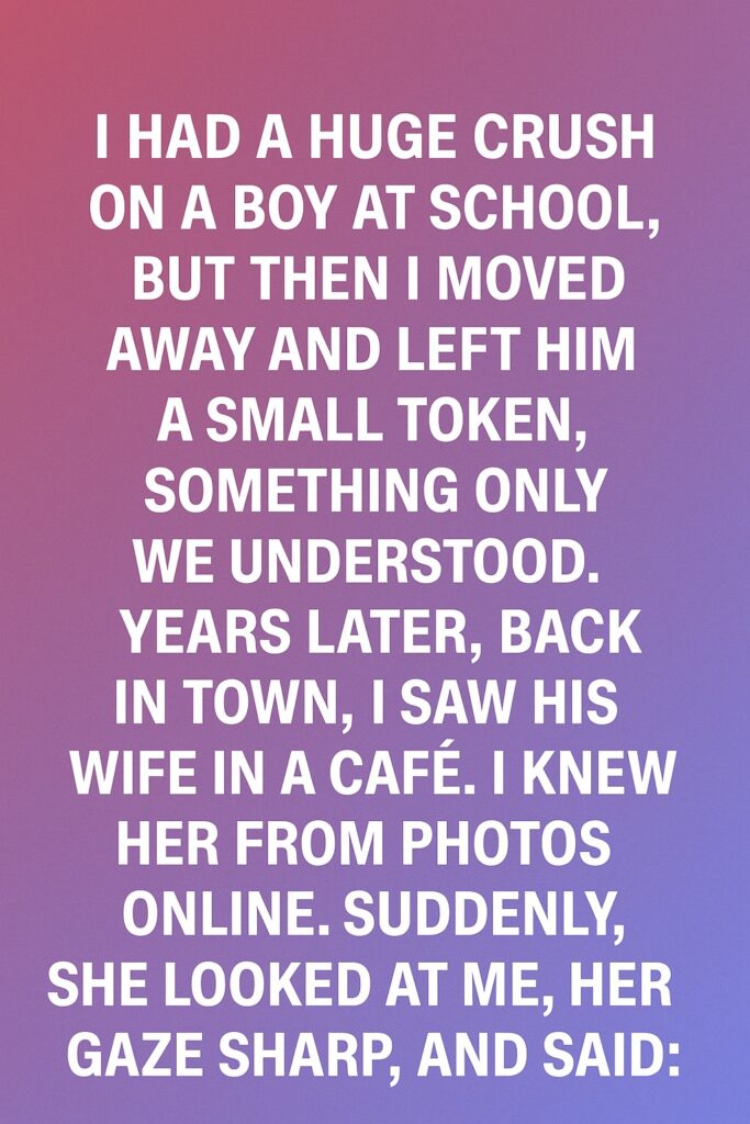 I had a huge crush on a boy at school, but then I moved away and left him a small token, something only we understood. Years later, back in town, I saw his wife in a café. I knew her from photos online. Suddenly, she looked at me, her gaze sharp, and said “You’re the one who left him that bracelet, aren’t you?” My heart stopped.