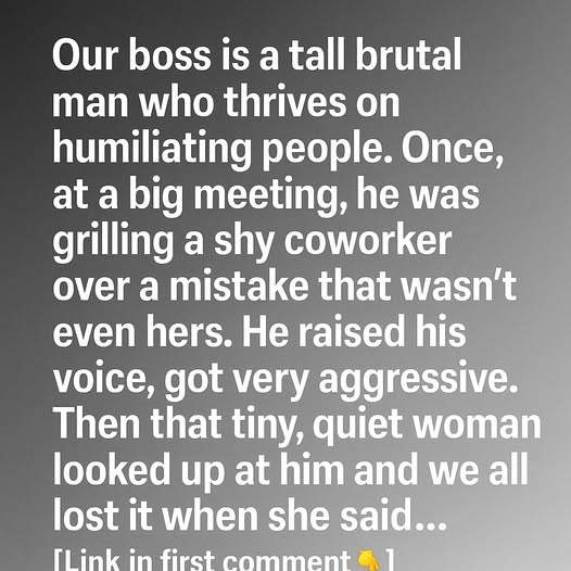 Our boss is a tall brutal man who thrives on humiliating people. Once, at a big meeting, he was grilling a shy coworker over a mistake that wasn’t even hers. He raised his voice, pacing like he wanted the whole room to feel just as small as the woman sitting across from him. Most of us looked down at our notes, pretending to review papers we already knew by heart—anything to avoid becoming his next target. But the air felt heavy, charged with the quiet knowledge that we were watching something deeply unfair unfold right in front of us.