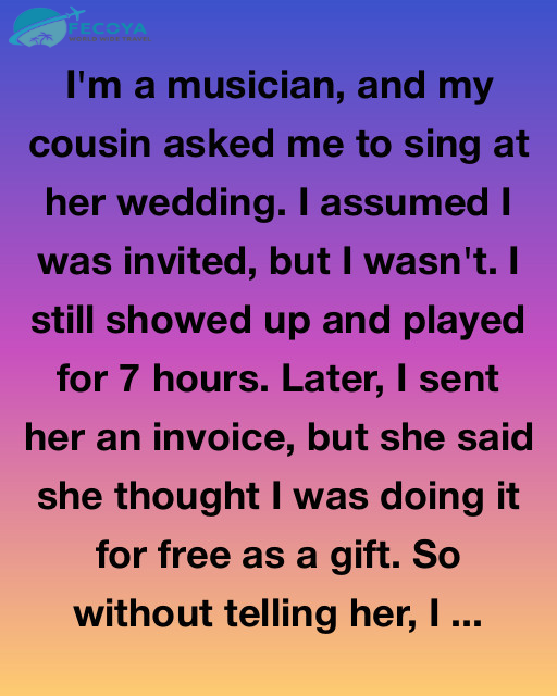 I’m a musician, and my cousin asked me to sing at her wedding. I assumed I was invited, but I wasn’t. I still showed up and played for 7 hours. Later, I sent her an invoice, but she said she thought I was doing it for free as a gift. So without telling her, I posted a short clip from the wedding on my socials, thanking “the Johnson wedding” for booking me for a full-day set. No names, no drama. But the fallout? Way more than I expected.