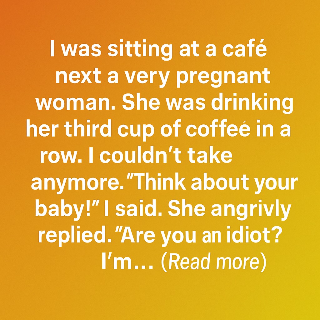 I was sitting at a café next to a very pregnant woman. She was drinking her third cup of coffee in a row, and the sight gnawed at me until I couldn’t keep quiet. “Think about your baby!” I blurted out, unable to hold back my concern. She turned sharply, eyes flashing with anger. “Are you an idiot?” she snapped. “I’m not pregnant—I’m a surrogate.”