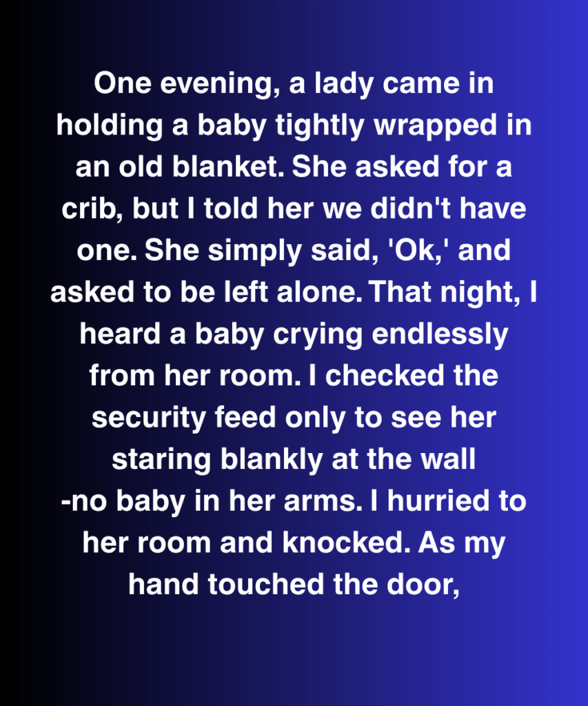 A woman entered with a baby wrapped in an old blanket one evening. She requested a crib, but we didn’t have one. She said, “Ok,” and requested privacy. I heard a baby sobbing nonstop from her room that night. Not holding her infant, I saw her staring blankly at the wall on the surveillance feed. I ran to her room and knocked. After touching the door, the crying stopped immediately, like someone had pressed mute on a remote.