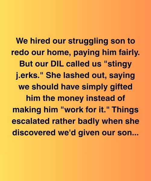 We hired our struggling son to redo our home, paying him fairly. But our DIL called us “stingy jerks.” She lashed out, saying we should have simply gifted him the money instead of making him “work for it.” Things escalated rather badly when she discovered we’d given our son a $12,000 bonus he never told her about.