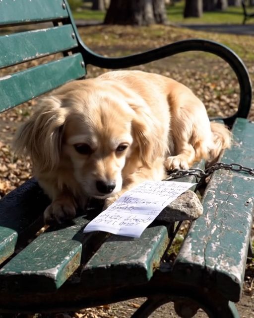 Someone made it appear temporary by barely looping it around the bench leg. One crumpled notebook page pinned down by a rock was beside him.