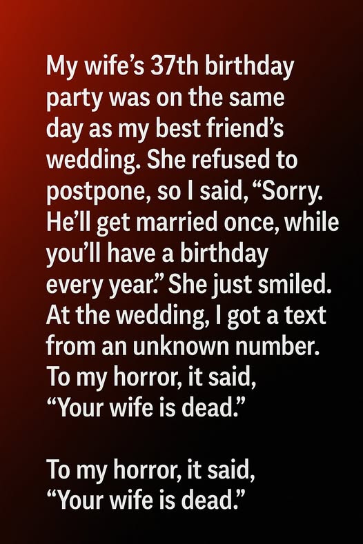 My wife’s 37th birthday party was on the same day as my best friend’s wedding. She refused to postpone, so I said, “Sorry. He’ll get married once, while you’ll have a birthday every year.” She just smiled. At the wedding, I got a text from an unknown number. To my horror, it said, “Your wife is dead.”