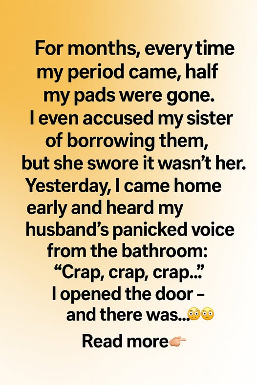 For months, every time my period came, half my pads were gone. I even accused my sister of borrowing them, but she swore it wasn’t her. Yesterday, I came home early and heard my husband’s panicked voice from the bathroom: “Crap, crap, crap…” I opened the door—and there he was, trying to quietly organize a small pile of pads and carefully reading a label like it was a complicated instruction manual. He froze, and the look on his face was a mix of guilt and pure confusion.