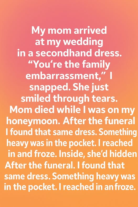 My mom arrived at my wedding in a secondhand dress. “You’re the family embarrassment,” I snapped. She just smiled through tears. Mom died while I was on my honeymoon. After the funeral I found that same dress. Something heavy was in the pocket. I reached in and froze.Inside the faded pocket was a small velvet pouch, the kind she used to keep her most precious things. My hands trembled as I opened it, revealing a delicate gold locket I had never seen before. It was engraved with my initials, intertwined with hers. When I opened it, a tiny folded note slipped out—yellowed around the edges and soft from being handled too many times. The handwriting was undeniably hers: steady, looping, and familiar. “For when you’re ready to understand,” it read. I sank to the floor with the dress pooling around me, the weight of my own words pressing down harder than gravity ever could.