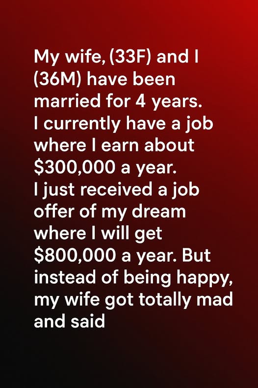 My wife (33F) and I (36M) have been married for 4 years. I currently have a job where I earn about $300,000 a year. I just received a job offer of my dream where I will get $800,000 a year. But instead of being happy, my wife got totally mad and said— that this new job would take me away from our home life. She worried that higher pay meant longer hours, constant travel, and missed dinners and milestones. She told me she didn’t marry a paycheck — she married a partner, someone who would be present for family moments and everyday life. I expected celebration; instead, I got fear and frustration. At first, I thought she was being unfair, not seeing how hard I had worked for this opportunity.