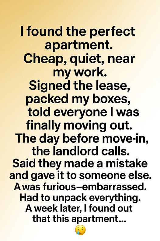 I found the perfect apartment. Cheap, quiet, near my work. Signed the lease, packed my boxes, told everyone I was finally moving out. The day before move-in, the landlord calls. Said they made a mistake and gave it to someone else. I was furious—embarrassed. Had to unpack everything. A week later, I found out that this apartment… had a serious plumbing issue that flooded the entire building. Neighbors lost furniture, floors buckled, and the walls soaked up water like sponges. What felt like an unlucky twist suddenly became a quiet blessing. I sat in my half-unpacked room, stunned, grateful, and a little amused by life’s timing. Sometimes what we think is a setback is really just a detour away from disaster.