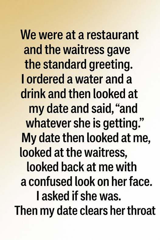 At a warm, bustling restaurant, my date and I settled into a cozy booth as the waitress greeted us with a friendly smile. I ordered a water and a drink, then motioned toward my date and said, “And whatever she is getting.” The waitress nodded politely, but my date paused. She looked at me, then at the waitress, and then back at me with a puzzled expression. I could tell something wasn’t quite right.