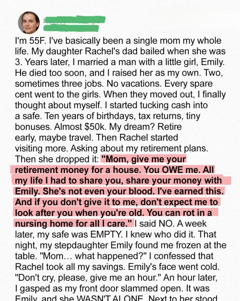One day, Julie discovered her savings were gone. Her heart shattered when she realized Rachel had taken it. Emily, determined to protect the mother who had raised her with unconditional love, confronted Rachel and forced her to return everything. In that painful moment, Julie realized the theft wasn’t just about money—it was about broken trust.