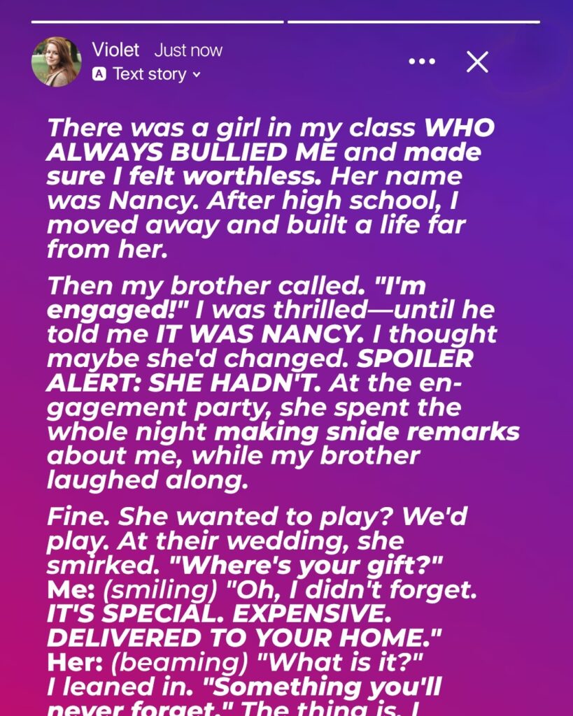 There was a girl in my class who always made me feel small and unworthy. Her name was Nancy. Throughout school, she found ways to humiliate me and crush my confidence. After graduation, I moved away, built a life of my own, and tried to leave those memories behind.Years later, my brother called me, his voice filled with excitement:”I’m engaged!”I was overjoyed—until he told me who it was.