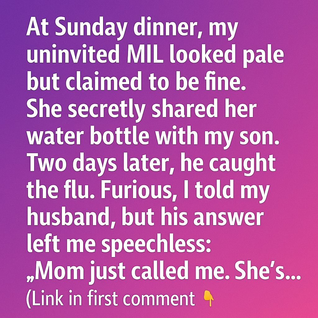 At Sunday dinner, my uninvited mother-in-law showed up looking pale. She insisted she was fine, and I didn’t want to cause a scene. What I didn’t know was that she quietly shared her water bottle with my son.Two days later, he came down with the flu. I was upset and told my husband, expecting him to be just as concerned.