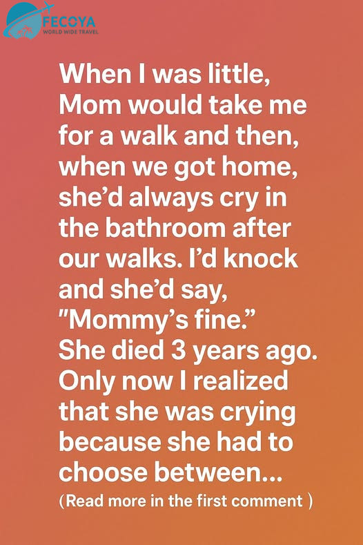 When I was little, Mom would take me for a walk and then, when we got home, she’d always cry in the bathroom after our walks. I’d knock and she’d say, “Mommy’s fine.” She died 3 years ago. Only now I realized that she was crying because she had to choose between…being strong for me and carrying the weight of her own battles. Back then, I never understood why those peaceful walks always ended with quiet sobs behind a closed door. I just knew she would wipe her eyes, smile at me, and go back to making my favorite snacks or reading me stories, pretending everything was okay. She wanted my childhood to be filled with happiness, even when her own heart felt heavy.