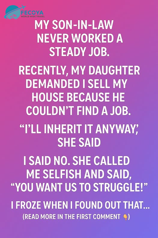 My son-in-law never worked a steady job. Recently, my daughter demanded I sell my house because he couldn’t find a job. “I’ll inherit it anyway,” she said. I said no. She called me selfish and said, “You want us to struggle!” I froze when I found out that…she had been planning this with him for months. My home isn’t just a building; it’s where I raised my children, planted my garden, and built a life filled with memories. I worked hard for decades to keep it, especially after becoming widowed. When my daughter insisted I sell it to support them, I felt a sadness deeper than anger. I wanted to help her, but giving up my home felt like losing a part of myself.