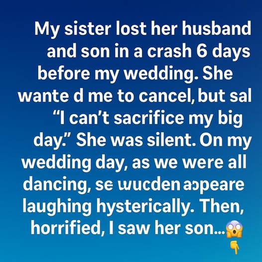 My sister lost her husband and son in a tragic crash just six days before my wedding. Heartbroken and shattered, she asked me to cancel. But I was stubborn, saying, “I can’t sacrifice my big day.” She didn’t argue further—she simply went quiet, her silence heavier than any words. When the wedding day arrived, everything seemed perfect. The music played, guests laughed, and the dance floor glowed with happiness. I should have been overjoyed, yet a part of me felt a strange emptiness knowing my sister was grieving alone.