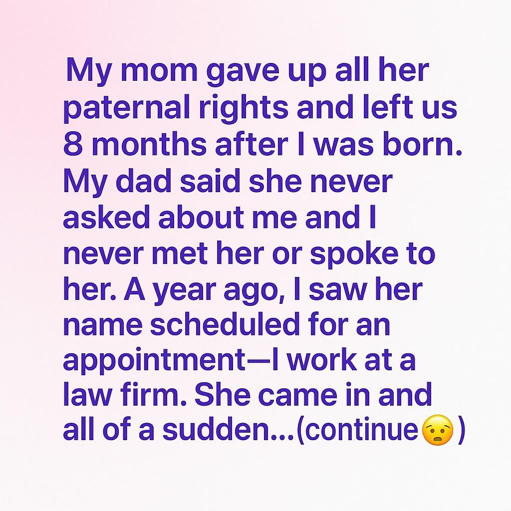 My mom gave up all her parental rights and left when I was just 8 months old. Growing up, my dad told me she never asked about me, and so I never met her, never spoke to her, never even saw a picture of her as an adult. She was just a name—someone who existed, but not really in my world.About a year ago, while working at the law firm, I noticed a familiar name on the schedule for an appointment. At first, I thought it was just coincidence, but when the door opened and she walked in, I somehow knew—it was her.