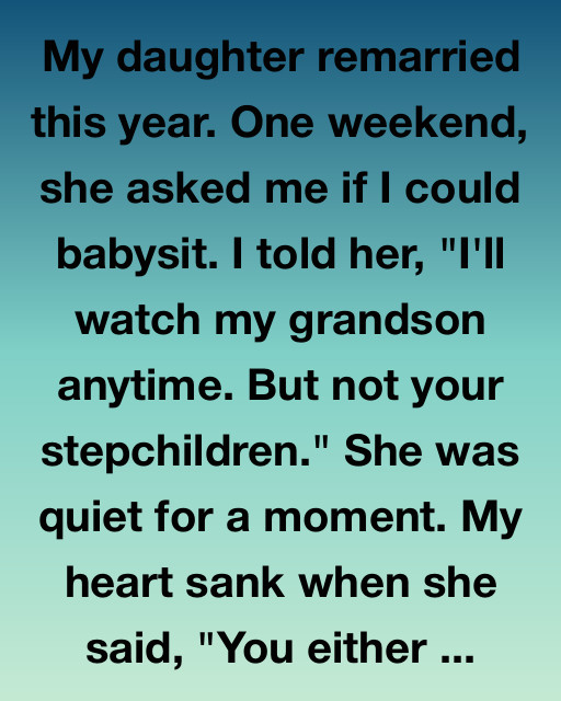 My daughter remarried this year. One weekend, she asked me if I could babysit. I told her, “I’ll watch my grandson anytime. But not your stepchildren.” She was quiet for a moment. My heart sank when she said, “You either babysit all of them, or none of them.”