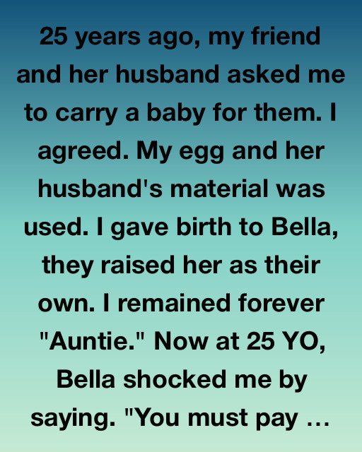 25 years ago, my friend and her husband asked me to carry a baby for them. I agreed. My egg and her husband’s material was used. I gave birth to Bella, they raised her as their own. I remained forever “Auntie.” Now at 25 years old, Bella shocked me by saying, “You must pay.”